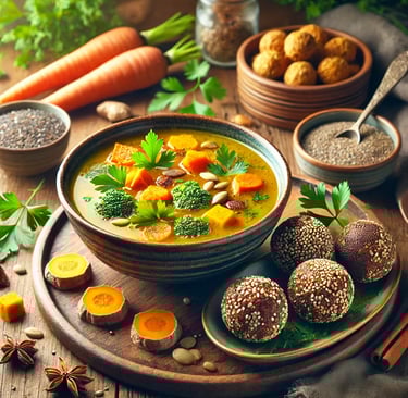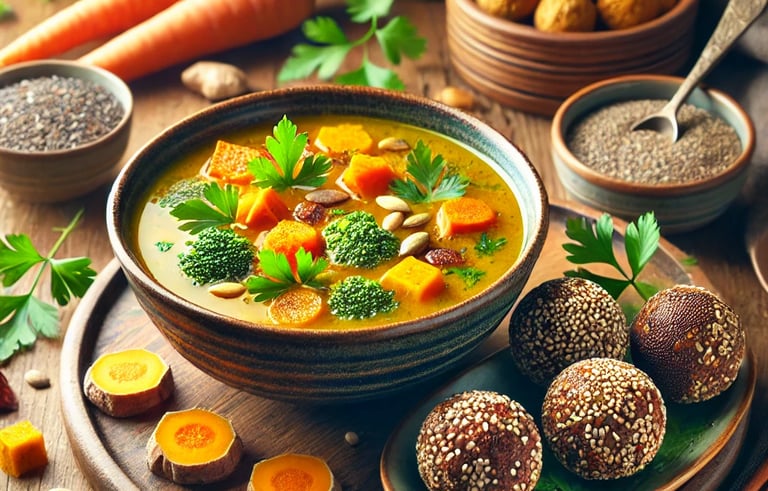 Les ingrédients de cette soupe sont un mélange délicieux de curcuma, de gingembre, d'ail, de patate douce, et de diverses herbes fraîches comme le persil et la coriandre. Le curcuma et le gingembre, en particulier, sont réputés pour leurs propriétés anti-inflammatoires qui renforcent notre système immunitaire. La patate douce, quant à elle, offre une source d’énergie durable et est riche en vitamines A et C. N'oublions pas l'ail, connu pour ses vertus antibactériennes qui soutiennent notre système cardiovasculaire.